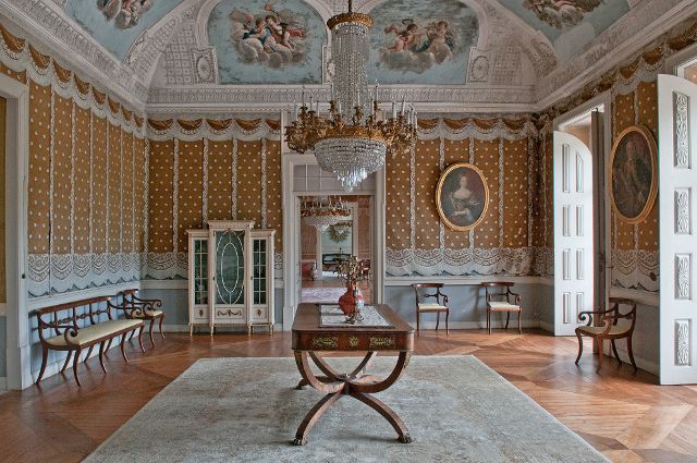 Lá tem um teatro particular que é uma graça! O fundo do teatro é o próprio palácio e, por ser particular, somente os donos e convidados poderiam assistir às peças. Além do gracioso teatro, há o lago dos cisnes, uma sala onde o retrato do rei acompanha seus passos, uma capela e até adega! Vocês acreditam que o palácio também produz vinho? Ah, na capela existe um lugar reservado para os donos e um outro para os trabalhadores que atuavam diretamente na produção do vinho. Aos empregados do interior do palácio só era permitido escutar a missa.